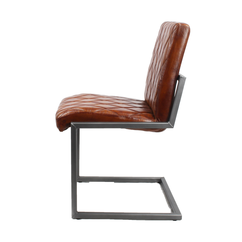 Der elegante Lederstuhl Ohne Arm Cognac ohne Armlehne im Industriedesign mit manuell gefertigtem Metall-Rahmen. Der Metall-Rahmen wird nach dem Schweißen noch mit einer Schicht Klarlack pulverbeschichtet, um Korrosion und Kratzspuren zu vermeiden. Die Sitzschale wird aus 100% Büffelleder gefertigt. Das Leder wird per Hand gegerbt, gefärbt und vernäht. Freischwinger-Stühle bieten auf Grund ihrer Konstruktion ein angenehmes Sitzgefühl und hohen Sitzkomfort. Das robuste Stahlgestell und eine qualitativ hochwertige Verarbeitung garantieren eine lange Lebensdauer. Das Produkt wird fertig montiert ausgeliefert. Zusammen mit den Lederüberzügen an den Armlehnen bieten die Lentstühle (???) exklusiven Entspannung.
