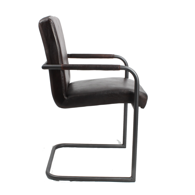 Der elegante Büffelleder-Industrial Design Möbel-Freischwinger-Lehnstuhl mit Armlehne im Industriedesign mit manuell gefertigtem Metall-Rahmen. Der Metall-Rahmen wird nach dem Schweißen noch mit einer Schicht Klarlack pulverbeschichtet, um Korrosion und Kratzspuren zu vermeiden. Die Sitzschale wird aus 100% Büffelleder gefertigt. Das Leder wird per Hand gegerbt, gefärbt und vernäht. Freischwinger-Stühle bieten auf Grund ihrer Konstruktion ein angenehmes Sitzgefühl und hohen Sitzkomfort. Das robuste Stahlgestell und eine qualitativ hochwertige Verarbeitung garantieren eine lange Lebensdauer. Das Produkt wird fertig montiert ausgeliefert. Zusammen mit den Lederüberzügen an den Armlehnen bieten die Lentstühle (???) exklusiven Entspannung.