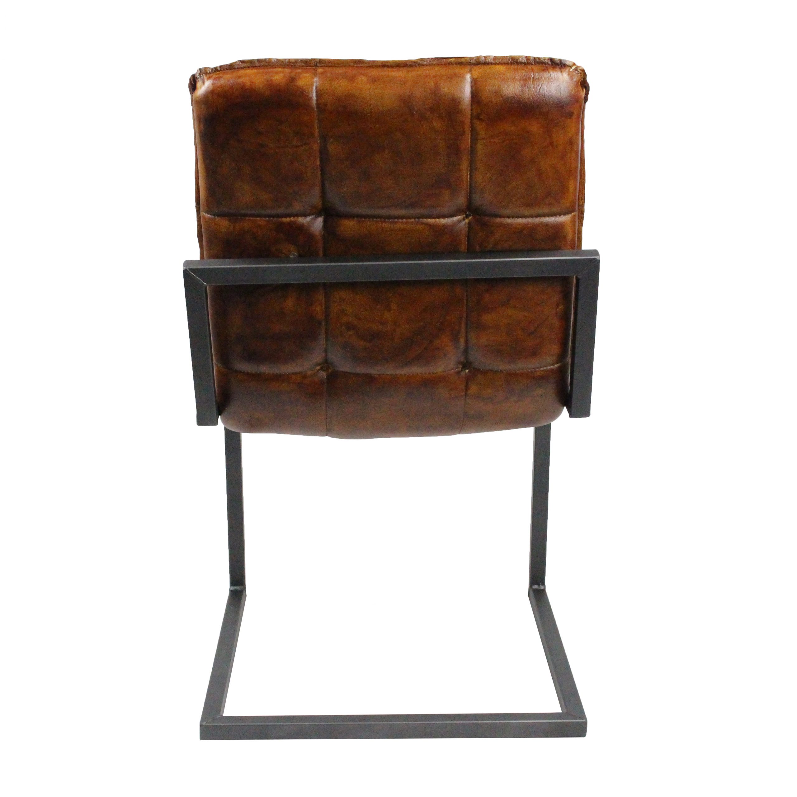 Der elegante Lederstuhl Ohne Arm Cognac ohne Armlehne im Industriedesign mit manuell gefertigtem Metall-Rahmen. Der Metall-Rahmen wird nach dem Schweißen noch mit einer Schicht Klarlack pulverbeschichtet, um Korrosion und Kratzspuren zu vermeiden. Die Sitzschale wird aus 100% Büffelleder gefertigt. Das Leder wird per Hand gegerbt, gefärbt und vernäht. Freischwinger-Stühle bieten auf Grund ihrer Konstruktion ein angenehmes Sitzgefühl und hohen Sitzkomfort. Das robuste Stahlgestell und eine qualitativ hochwertige Verarbeitung garantieren eine lange Lebensdauer. Das Produkt wird fertig montiert ausgeliefert. Zusammen mit den Lederüberzügen an den Armlehnen bieten die Lentstühle (???) exklusiven Entspannung.